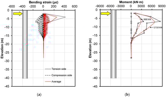 For the design load of 900 kN and the maximum load of 1710 kN, the moment generated within the pile was calculated based on the wavelength variations depicted in Figure 10a,b. These moments are presented as functions of depth in Figure 11b. The maximum moment was observed at level 8, corresponding to an elevation of −6.8 m, where an FBG sensor was installed. The maximum moment values were determined to be 3520.2 kN·m at a loading of 900 kN and 8364.9 kN·m at a loading of 1710 kN. Additionally, through linear regression analysis of the evaluated moments based on the measured bending strains, the moments at the 900 kN and 1710 kN loads were estimated to be 2792.3 kN·m and 6790.4 kN·m, respectively. These moment values are critical for validating the inverse analysis discussed in the next section.