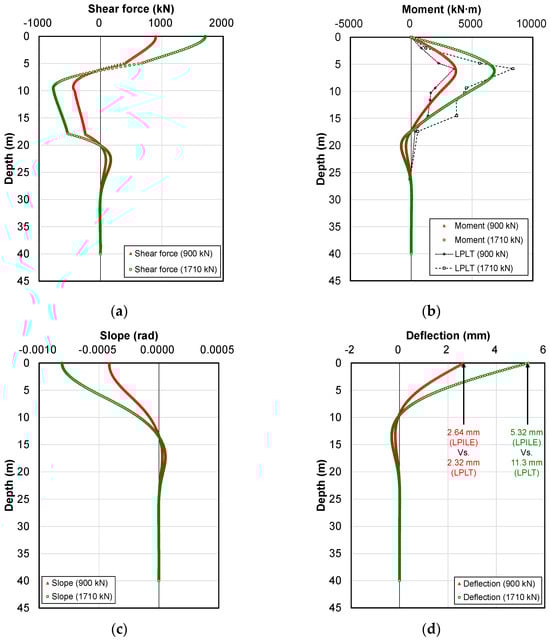 Figure 12 shows the comprehensive responses of a single pile under lateral loading through LPILE, focusing on shear force, bending moment, slope, and lateral deflection at two critical load levels: the design load of 900 kN and the ultimate load of 1710 kN. These figures provide a detailed insight into the pile’s behavior at different stages of loading, enabling a deeper understanding of the pile’s structural performance.