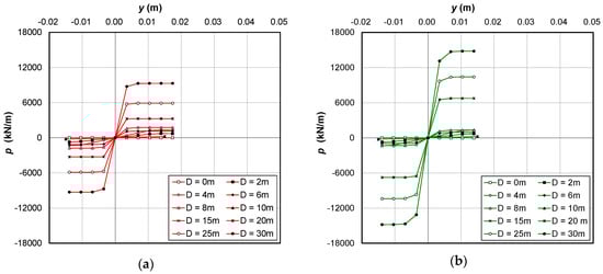 Depth-dependent p-y curves for a load of (a) 900 kN and (b) 1710 kN.