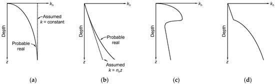 Variation in the kh coefficient with depth: (a) preloaded cohesive soil; (b) granular soil, silt, and normally loaded clay; (c) dried normally loaded clay; and (d) soft ground layer (after Davisson [52]).