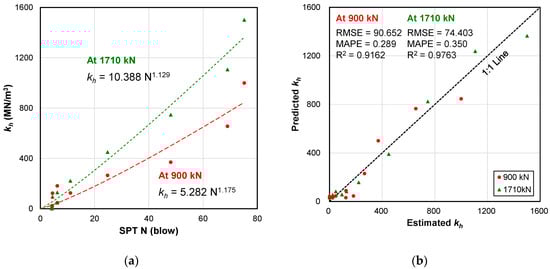 To estimate the performance of the empirical formulas, the performance of the equation was assessed by using the root-mean-square error (RMSE), mean absolute percentage error (MAPE), and correlation coefficient (R2). Figure 16b presents a performance evaluation plot comparing the predicted kh values to the estimated kh values. A 1:1 line (dashed) is included to indicate perfect agreement between predicted and estimated values. For the 900 kN loading condition, the results of RMSE, MAPE, and R2 were 90.652, 0.289, and 0.9162, respectively. For the 1710 kN load, the results of RMSE, MAPE, and R2 were 74.403, 0.350, and 0.9763, respectively, demonstrating even higher predictive accuracy with a lower RMSE and a higher R-squared value, despite a slightly higher MAPE. By correlating the N value with the kh coefficient, we can develop a practical and reliable method for estimating the coefficient based on easily obtainable field data. This empirical equation enables engineers to quickly assess the ground properties without the necessity for extensive in situ experiments, streamlining the design and analysis process for various geotechnical applications.