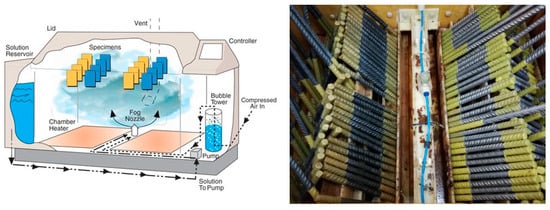 The salt spray chamber (Figure 4) follows the specifications of the ASTM standard B117 (1997) [], where reinforcing rebars are corroded using suitable equipment at a constant temperature of about 35 °C (with deviations of +1.1 to −1.7). Τhe formation of a cloud of sodium chloride solution containing 5% by mass of the solvent (distilled water) is required inside the chamber. Spray valves help to produce the cloud at high temperature and pressure, while the pH ranges from 6.5 to 7.2. In order to achieve a more accurate reproduction of the conditions prevailing in the natural coastal environment, and in particular in the exposure category XS1 according to the EN 206 [], the specimens are subjected to wetting–drying cycles. More precisely, the daily operation of the accelerated method includes 8 wetting-drying cycles of 3 h each, i.e., 1.5 h of wetting and 1.5 h of drying [].