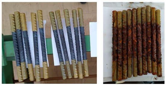 The corrosion damage of all tested specimens was estimated upon the completion of the accelerated corrosion process in terms of percentage mass loss of steel rebars. The values of mass loss for steel grades of B500c, B450, and DPF subjected to electro-corrosion are presented in Table 2, and the percentage mass loss of S400 steel rebars, as determined via corrosion tests in the salt spray chamber, are presented in Table 3. The corrosion damage of all steel grades is illustrated in Figure 4.