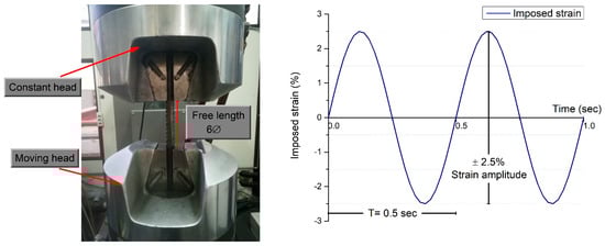 All rebars were subjected to cyclic loadings with a constant strain amplitude of ±2.5% so as to simulate their seismic behavior and simultaneously reduce the buckling phenomenon []. The loading frequency was set at 2 Hz, and the free length of specimens was equal to six times their diameter (6Ø) with the aim of simulating the spacing of transverse reinforcement (stirrups) in RC members designed with modern regulations (Figure 7).