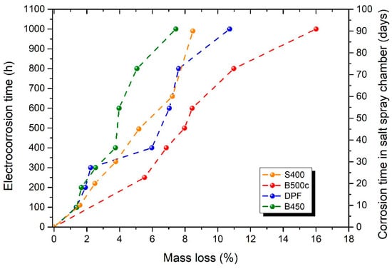 Figure 8 illustrates the increase in corrosion damage in terms of percentage mass loss as a function of the accelerated corrosion time for all tested grades of steel reinforcement. At this point, it is worth mentioning that in the case of single-phase S400 steel, the accelerated corrosion method using a salt spray chamber was adopted, and the corrosion time is presented on the right vertical axis; meanwhile, in the case of B500c, B450, and DPF, the impressed current density corrosion method was adopted, and the electro-corrosion time is presented on the left vertical axis.