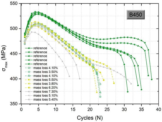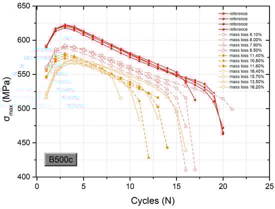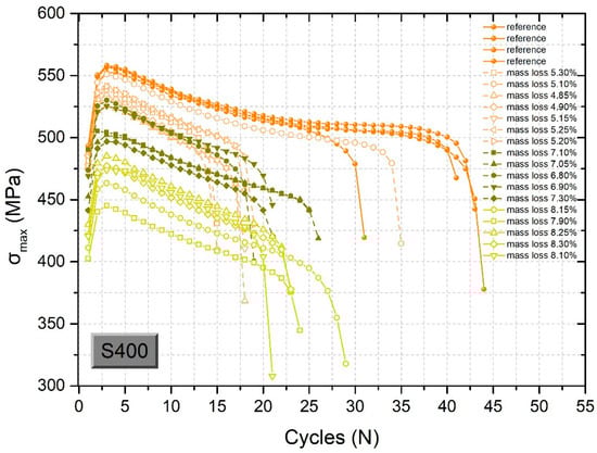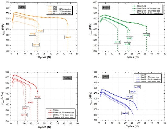 It is obvious from Figure 10 that the dynamic behavior of S400-grade steel is significantly affected by corrosion, since the curves of the recorded maximum stress per load cycle diverged significantly under corroded conditions compared to these under reference (uncorroded) conditions. The maximum stress of the S400 corroded rebars for about 8.0% mass loss dropped by 18% compared to the uncorroded rebars. Furthermore, the ductility of S400 corroded rebars dropped sharply even at a low corrosion level of 4.8%. In particular, single-phase steel S400 demonstrated a sharp drop of about 51% of its service life (from 43 to 21 cycles) for a corresponding mass loss of 5.2%. However, for higher corrosion levels of up to 8.1%, we observed no significant reduction in the number of load cycles before failure. The decrease in service life was equal to 56% (from 43 to 19 cycles) and 58% (from 43 to 18 cycles) for corresponding mass losses of 7.3% and 8.5%, respectively.
