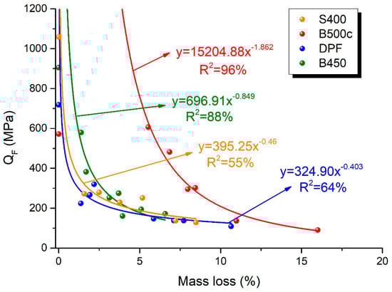 Regarding the obtained results, as depicted in Figure 15, the modified fatigue indexes of single-phase S400 steel, Tempcore B450 steel, and dual-phase steel F depicted similar trends with the increase in the time of exposure to corrosion, as the service life of each grade of steel reinforcement dropped sharply until a mass loss of about 10%. However, steel B500c demonstrated a constant value for mass loss of up to 5% and thereafter steadily decreased until a mass loss of about 15%.