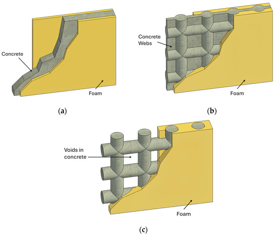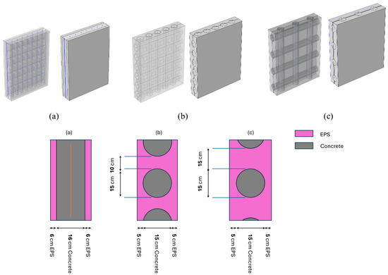Illustrations of different designs of ICF wall systems: (a) Wall ; (b) Wall ; (c) Wall .