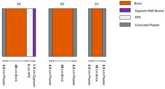 In this study, the thermal performance of three brick walls featuring different thicknesses of brick and insulating layers was explored, as depicted in Figure 3. The investigation involved testing three wall systems with dimensions of 149 cm × 124 cm and varying thicknesses as follows: