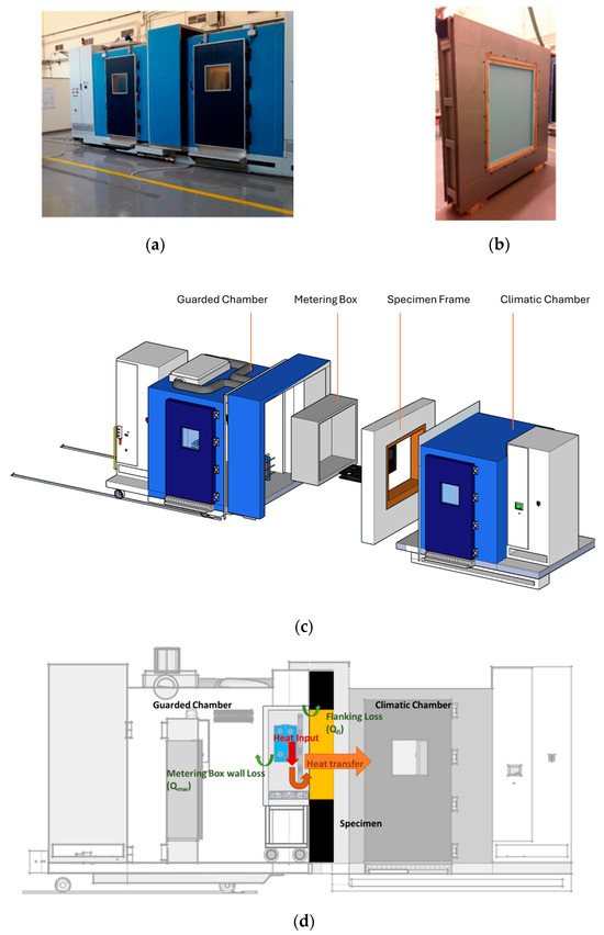 Test apparatus and specimen: (a) Test rig; (b) Testing frame; (c) Exploded 3D model of the test apparatus and components; (d) Schematic diagram of the heat transfer in the hotbox apparatus.