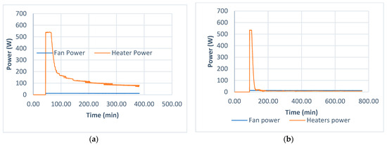 Variations of heater and fan power with time during Test 1: (a) Wall ; (b) Wall .