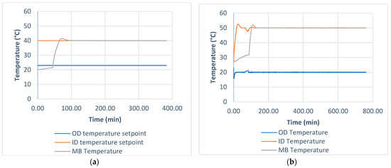 Variations of ID, OD, and MB (Mean Box) temperatures with time during Test 1: (a) Wall ; (b) Wall .