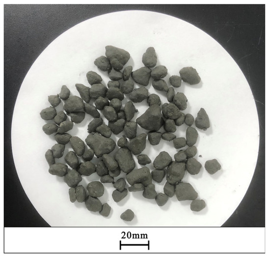 We used shale ceramisite from Gongyi, Henan Province, China, as the PCM vessel. This shale ceramisite granule had a particle size range of 5–20 mm, which met the requirement for continuous grading. The shale ceramisite particles were incinerated, cooled and crushed to form a rich pore structure, which provided sufficient space for the impregnation of PCM [20]. The porosity measured by mercury intrusion porosimetry (MIP) was 33.30% and the pore volume was 0.3321 cm3/g. These properties made shale ceramisite an ideal carrier for PCM. Dodecane polymer, tridecane polymer and tetradecane polymer were prepared by encapsulating three alkanes in shale ceramisite by the vacuum impregnation method [21]. In this work, a dual-coating system was used to increase the PCM aggregate’s thermal conductivity and stop leaks during phase transitions. The system consisted of a first layer of epoxy resin composite and a second layer of cement powder. The coating material, E51 epoxy resin, was applied, and to speed up the curing process, T31 phenolic glycidyl ether epoxy resin curing agent was used. To further enhance the thermal conductivity of the epoxy composite, diluent-based glycidyl ether (CH1122) and 10,000 mesh ultrafine graphite powder were incorporated. The first layer consisted of ultrafine graphite powder, diluent, curing agent and epoxy resin in a ratio of 0.1:0.15:0.2:1. The second layer, made of cement powder, was applied to the epoxy resin to improve the interface properties between the PCM aggregate and the matrix. The completed PCM aggregate was prepared as shown in Figure 2 [22].