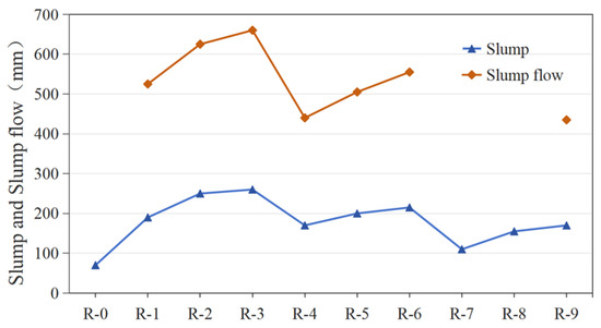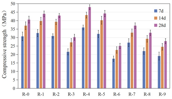 Concrete’s workability is an important prerequisite for its excellent mechanical properties and durability. One can assess the concrete’s workability by observing its slump. The slumps of PCM concrete with different mixtures are shown in Figure 4. This study showed that the workability of PCM concrete incorporated with RHA and FA was significantly improved. The effect of the slump could be improved well by adding FA and RHA. This phenomenon occurred because the incorporation of RHA and FA reduced the amount of cement, and its micro-bead effect released the filling water between the cement particles so that the paste and the PCM aggregate was better encapsulated, which enhanced the fluidity of the concrete [34]. This phenomenon may also be traced to the fact that the incorporation of RHA and FA improve the water retention capacity of the concrete, further contributing to the slump.