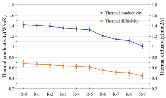 In this research, thermal conductivity and thermal diffusivity were measured, and volumetric specific heat capacity was computed employing the transient planar source (TPS) method [27] with a Hot Disk 2500S device. A double-helix structure etched on a thin nickel sheet served as a dynamic temperature sensor and the heat source. A mica-insulating layer was placed between two specimens to form a sandwich structure, which was then electrically heated by the Joule effect. A least squares fitting technique was used to measure the thermal diffusivity and conductivity, and the volumetric specific heat capacity was computed according to Equation (1) [28]: