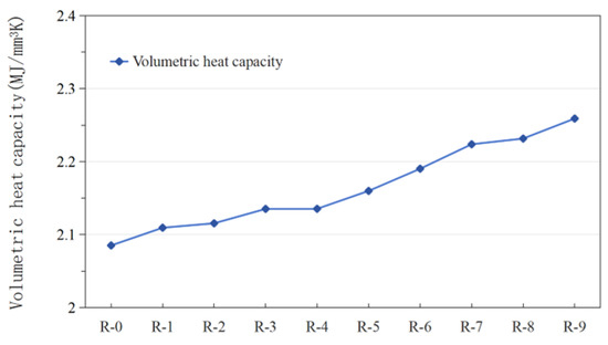 Equation (1) was used to calculate the volumetric heat capacity, which is displayed in Figure 6. Instead of specific heat capacity, volumetric heat capacity was used in this study. The findings demonstrated that the incorporation of FA and RHA enhanced the volumetric heat capacity of concrete. PCM concrete with 15% RHA and 30% FA substitution exhibited a volumetric heat capacity of 2.259 MJ/m3K, which was 1.08 times greater than that of the control concrete without FA and RHA. This suggests that in order to alter the temperature of PCM concrete with RHA and FA, more thermal energy is needed, thereby increasing its thermal inertia and aiding in temperature regulation.