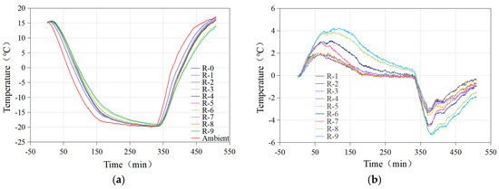 Due to heat loss, all specimens showed the same internal temperature trend during the cooling process, which decreased with the outside temperature. The incorporation of RHA and FA increased the volumetric heat capacity of the concrete, resulting in a slower thermal response compared to the control group. Specifically, PCM concrete with 15% RHA and 30% FA exhibited the slowest thermal response. The PCM concrete with 15% RHA and 30% FA only had an interior temperature of −12.7 °C when the outside temperature reached −18 °C. In contrast, the control group’s internal temperature was nearly −15.4 °C. Figure 7b shows that the latent heat release phase for R-8 and R-9 occurred between 0 and 350 min, which was primarily influenced by the RHA admixture. For the remaining groups, the latent heat release phase occurred between 0 and 150 min, which was mainly influenced by the PCM aggregate. Higher FA content improved the thermal effect during this phase, with temperature differences reaching up to 4 °C compared to the control group. After the latent heat release stage, the temperature difference between the control concrete and the PCM concrete with RHA and FA steadily approached zero due to the decreasing ambient temperature.