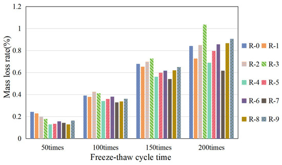 where m0 represents the original mass, stands for the mass following n time freeze–thaw cycles and the mass loss rate following time freeze–thaw cycles is denoted by .