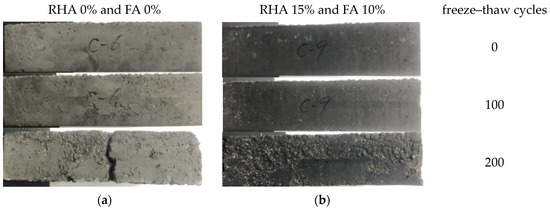 The morphology of concrete under 0, 100 and 200 freeze–thaw cycles. (a) RHA 0% and FA 0%. (b) RHA 15% and FA 10%.