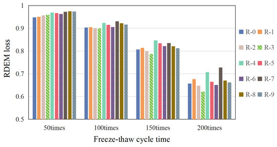 Figure 10 illustrates the RDEM losses of PCM concrete with varying replacement amounts of RHA and FA. During the initial 50 cycles, the differences in RDEM loss among the groups were minimal. Through 100 freeze–thaw cycles, the variations became more pronounced, indicating differing rates of loss. Following 100 cycles, the control group’s RDEM dropped to 90%, and after 200 cycles, it was at 66%, indicating significant damage. In contrast, the concrete with RHA and FA additions exhibited varied RDEM losses compared to the control group, due to the different temperature control effects exerted by the varying replacement amounts of RHA and FA.