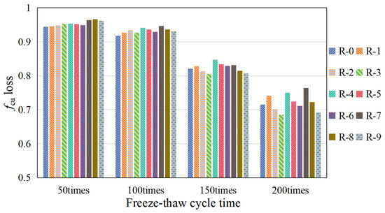 Concrete specimens were weighed using rags to remove surface moisture from the specimen blocks before weighing, and the rate of mass loss was measured using Equation (2) after the specified cycles of freeze–thaw. The rate of RDEM loss was calculated using Equation (3) after testing the cubes’ RDEM using an ultrasonic tester. The rate of loss of compressive strength was calculated using Equation (4) after testing the cubes for compressive strength using a compression tester.