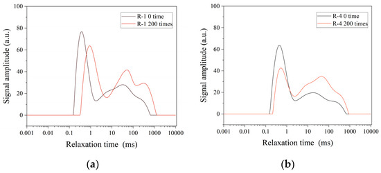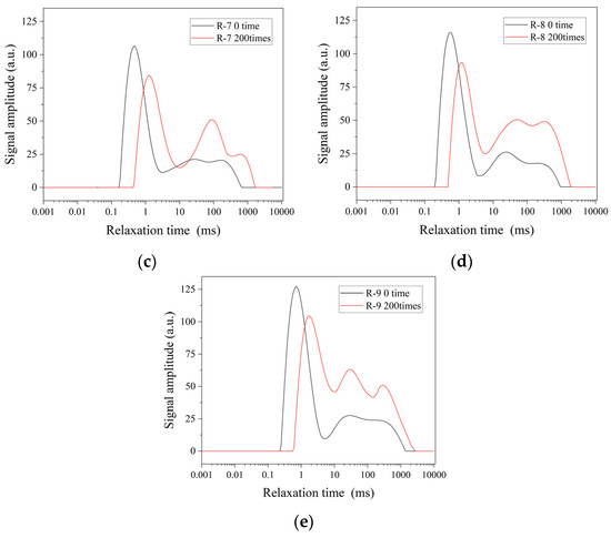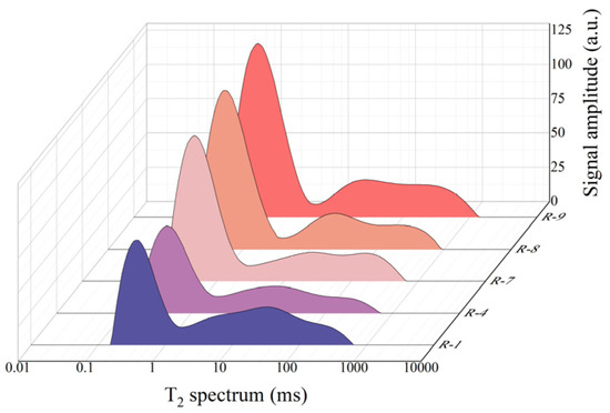 The nuclear magnetic resonance (NMR) technique has unique advantages in measuring and characterizing the pore distribution of materials. It can non-destructively penetrate the material and provide information about the internal structure [30]. The NMR technique relies on the magnetic resonance phenomenon of atomic nuclei in a magnetic field, where different pore sizes and shapes affect the relaxation behavior of the nuclei, thus providing information about the pore structure. NMR infers the size, shape and distribution of pores by analyzing the relaxation behavior of fluids in the pores. When pores in a material are filled with water, protons (hydrogen nuclei) in the pore water will exhibit specific relaxation behavior in an external magnetic field. The transverse relaxation time (T2) spectrum measures how long it takes for a proton to lose coherence and return to its ground state in an external magnetic field. Larger pores typically correspond to longer T2 relaxation times, while smaller pores correspond to shorter T2 relaxation times. The correlation between relaxation times and pore properties can be estimated using Equation (5).