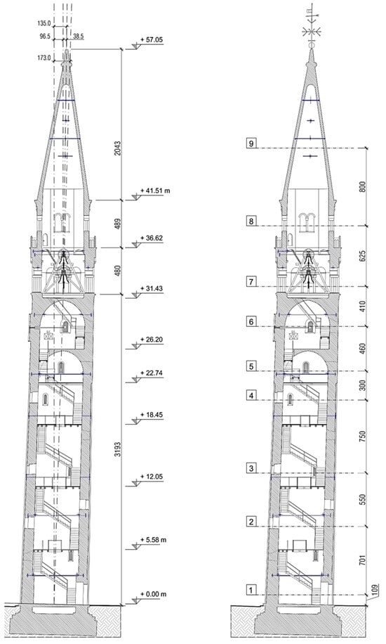 The peculiarity of this structure is its significant tilt towards the northeast. The inclination, believed to be due to a rigid rotation of the tower’s foundation, has very early origins. It is evident that the masonry near the bell chamber, besides having a different texture, also presents a different inclination, being more vertical than the underlying part due to an elevation between 1877 and 1879. The spire, obviously supposed to have been conceived vertically, also shows a slight deviation from the plumb line. This observation indicates a progressive phenomenon over time. A geometric survey of the entire structure was conducted in 2001, which shows a noticeable general inclination compared to the vertical axis, confirming the above observations. During the survey at the northeast corner of the balcony above the bell chamber, located about 37 m from the ground, the deviation from the plumb line was about 1.2 m. Figure 2 shows the section view of the tower.
