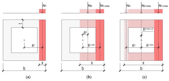 As mentioned in the previous section, Equation (3) is valid only for certain conditions, where one single wall of the cross-section can withstand the tower’s total weight. For very slender structures, as a vast number of masonry towers are, this condition very often is not fulfilled; henceforth, it is required to analyze case by case the section’s capacity to withstand an overturning moment. In the following formulation, Equation (3) of the guideline is extended to the general case, according to the ultimate state depicted in Figure 3.