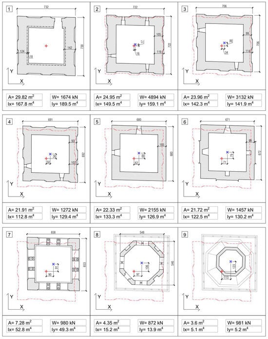 Current regulations require that a properly designed structure should be able to fulfill a multi-level performance requirement, i.e., likely to withstand frequent earthquakes without significant damage and not collapse during rare events. This whole approach implies considering many uncertainties and different seismic scenarios to approximate the structural performance closer to its reality. The goal would be to achieve the most probable failure mechanisms and to investigate the structure’s limit state. For a simplified geometry, typical failure mechanisms of unreinforced masonry bell towers, as presented in literature [,,,], could fairly approximate their ultimate state under seismic loads. These approaches are fundamentally based on simplified geometries of towers, by considering the shaft of the tower as a hollow polygon geometric shape, which will be able to withstand safe for the design loads. This approach has turned out to be quite accurate in providing reliable results on how these structures will respond to vertical and lateral loads. Many normatives that are relatively important in the scientific and engineers’ community provide the best current code of practice to address these structures, like the Italian and Eurocodes [,,,,].