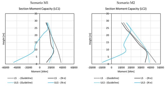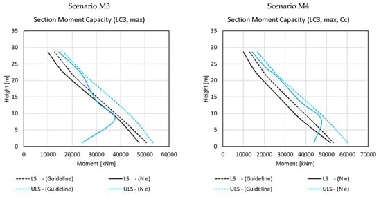 Figure 5 shows the numerical results of the cross-section capacity. Each sub-image has four graphs, respectively: (i) LS (Guideline)—section capacity for dynamic loading according to Equation (3) without applying any check or correction; (ii) LS (Ne)—section capacity for dynamic loading according to Equation (5); (iii) ULS (Guideline)—section capacity for static loading according to Equation (3) without applying any check or correction; (iv) ULS (Ne)—section capacity for static loading according to Equation (5). The first observation is that the LS capacity is higher than the ULS capacity due to the utilization of a lower partial safety factor, , instead of .