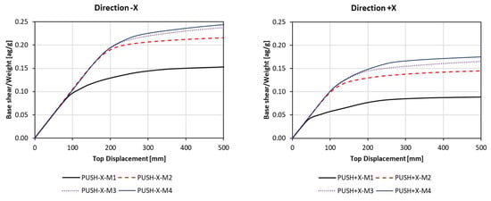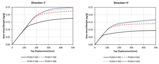 Pushover analyses have been conducted on the tower for all four principal directions: dir. +X, dir. −X, dir. +Y, and dir. −Y. It should be noted that according to Italian Code [,], when dealing with pushover analyses, the structure’s response should be investigated along the geometrical orthogonal axes X and Y, in both the positive and negative directions. In the present case, directions +X and + Y are towards the inclination of the tower; thenceforth, as expected, the capacity of the tower to withstand lateral loads is lower compared to the other directions, respectively dir. −X and dir. −Y, see Figure 8.