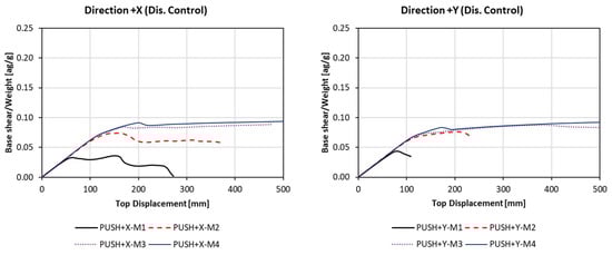 Based on the results reported in Figure 8, it is noted that the tower responds differently if the forces are parallel to the inclination or against the inclination of the tower. The lowest performance is achieved when the forces are parallel to the tower’s inclination, and these directions are further studied to assess the seismic capacity. Such a result is trivial considering that an inclination angle around 1.7° is really significant and in accordance with the expected behavior. The displacement control is then reported only for the case where the forces (displacement) increase in the direction of the current inclination; see the graphs in Figure 8.