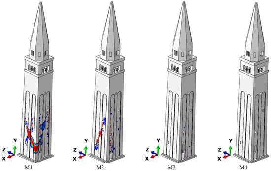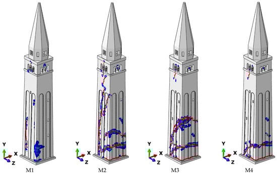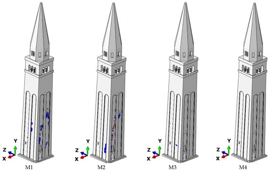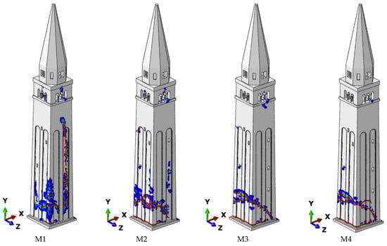 The damage patterns obtained from the analyses conducted by implementing a displacement control approach are reported in the following images. This choice is based on the fact that displacement control is more accurate in providing a correlation between displacement, base shear, and failure pattern. However, it is worth noting that similar patterns have been encountered for both approaches, with minor differences, which are understandable considering that the load patterns are not identical. The most notable conclusion worth highlighting is the formation of damage patterns in the compressed side, likely diagonally diffused or even forming a cross; see Figure 10 and Figure 11 for cases M1 and M2. Such a damage pattern shows the vulnerability of towers when they both exhibit low compressive strength and are inclined. It can be noticed that these crack diffusion patterns are influenced by the opening or reductions in sections, as occurred above the door of the tower.
