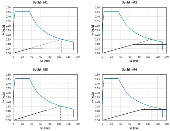 A simplified assessment procedure is also adopted for the seismic verification of the global structural behavior of the tower under study. The so-called N2 method developed by Fajfar [] and adopted by different codes is based on pushover analyses and inelastic demand spectrum. The demand spectrum is estimated according to the Italian Code [], without taking into consideration advanced studies on the local response spectrum. The method is formulated in the acceleration-displacement (AD) format, which enables the visual interpretation of the results. By means of a graphical procedure, the capacity of a structure is compared with the demand of an earthquake ground motion on the same structure, Figure 14. The capacity curve of the tower is transformed into a bilinear capacity curve of an equivalent SDOF system by means of the transformation factor . The elastic acceleration and the corresponding elastic displacement demand are computed by intersecting the radial line corresponding to the elastic period of the idealized bilinear system with the elastic demand spectrum. Due to the geometrical features of slender towers, as in the present case, the elastic period of the bilinear system is larger than (the upper limit of the period of the constant spectral acceleration branch), and the inelastic displacement demand is equal to the elastic displacement demand . The displacement capacity corresponds to the end point of the bilinear curve. From the obtained results, the M1 case represents a capacity lower than the demand. In the other cases, from M2 to M4, results show that the tower would be verified.