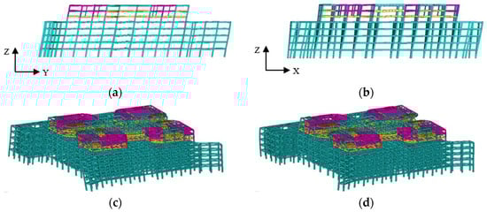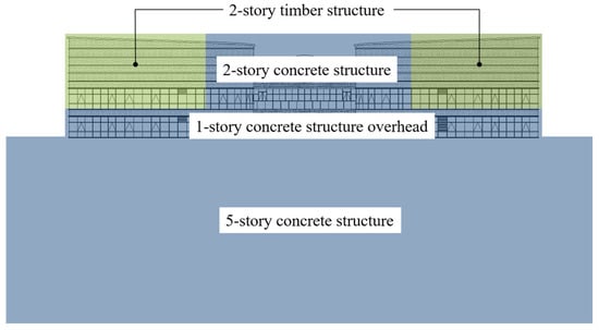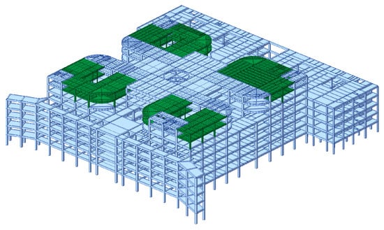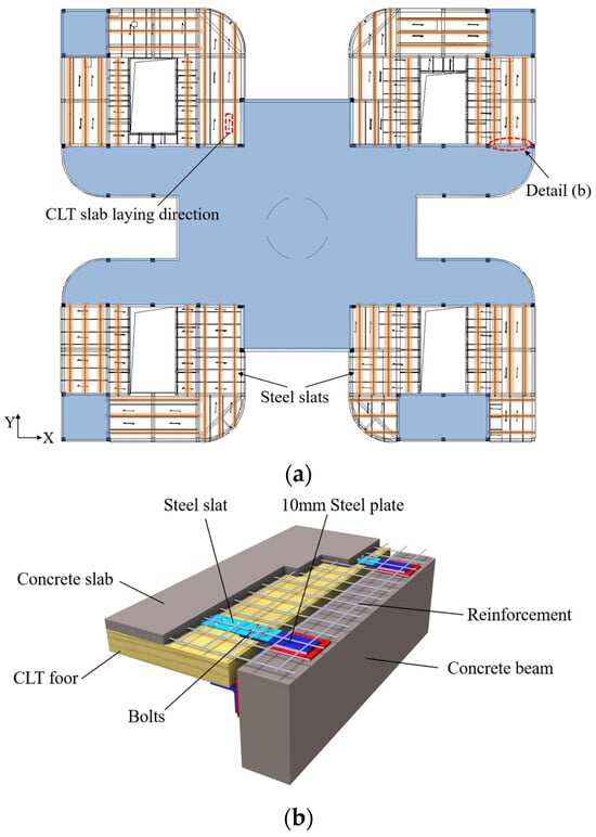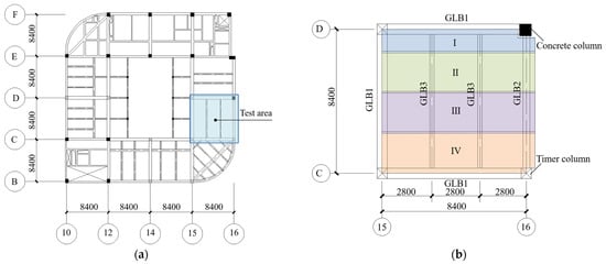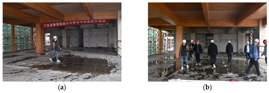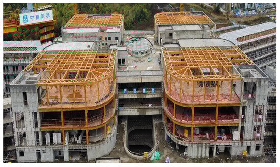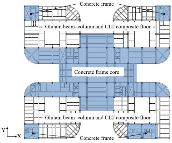 28]. For multi-story timber hybrid structures, the core is prone to stiffness concentration and structural torsion and can be replaced by a concrete frame instead of a core, but there are few relevant studies. Meanwhile, studies on the serviceability of CLT floors involving field measurements of human-induced vibration have been relatively rare, both in China and across the world. Given this, this paper takes as its focus an actual timber–concrete hybrid project in which the core was changed to a concrete frame as an example to analyze the overall seismic performance and investigate the dynamic performance and human-induced vibration of a local CLT floor. Serviceability conditions for different configurations of the CLT floor were also analyzed, and design recommendations to enhance the serviceability of the timber floor were proposed in light of the results obtained. The findings presented in this paper provide a practical reference for those engaged in seismic analysis and vibration serviceability of high-rise timber hybrid buildings.
