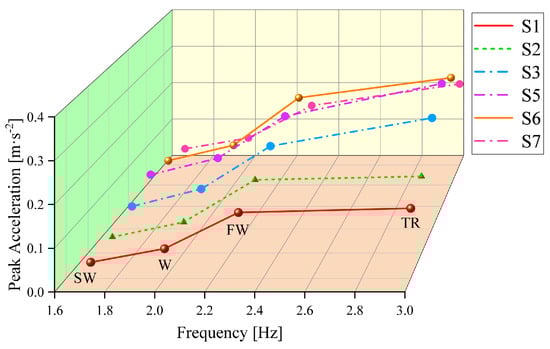 22] suggested a relationship between serviceability and peak floor acceleration; based on this, they suggested a peak acceleration limit for floors subjected to human-induced vibration, with peak acceleration being classified as follows: less than 0.0125 m/s