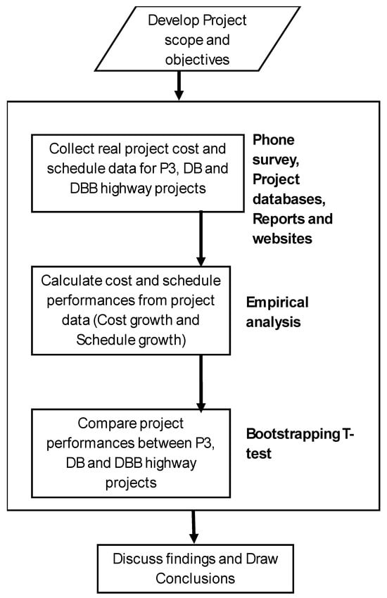 In this study, a bootstrapping t-test was employed to examine whether a significant difference in cost and schedule growth existed for projects executed under the P3, DB, and DBB project delivery methods. This resampling technique is particularly useful in situations in which the assumptions of traditional parametric tests are not met, such as when data are not normally distributed []. When data deviate from the normality assumption, a bootstrapping t-test can be applied to compare the significant differences between the data groups.