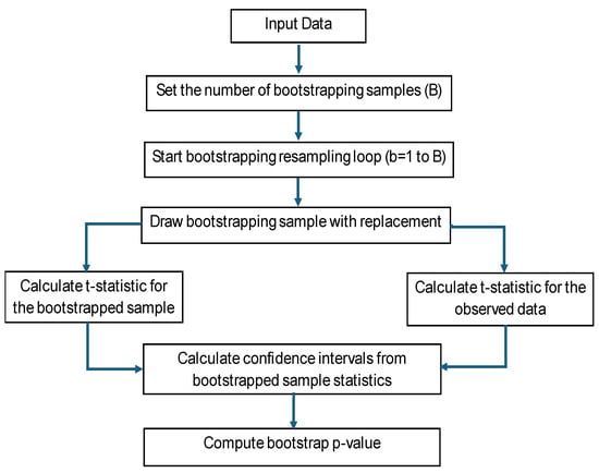 The primary goal of bootstrapping is to generate a t-statistic distribution by repeatedly resampling the data under consideration, allowing for replacement. Recent research by Zhao et al. (2021) shows that the bootstrap t-test outperforms the traditional t-test in terms of different measures of the testing accuracy []. This technique enables the calculation of the sampling distribution of the t-test statistic, even in cases when the data’s distribution deviates from normality [,]. The flowchart presented in Figure 2 shows the specific methodology adopted for bootstrapping in this research.