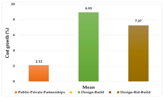 The results reveal that DB highway projects had mean cost growth of 8.95%, whereas DBB highway projects had a mean value of 7.27% for cost growth. In the t-test, the p-value of 0.502 (greater than the significance level of 0.05) suggests that the difference between the groups’ means was not statistically significant []. This indicates that the compared groups (DB and DBB projects) did not exhibit a meaningful distinction in their cost performance.