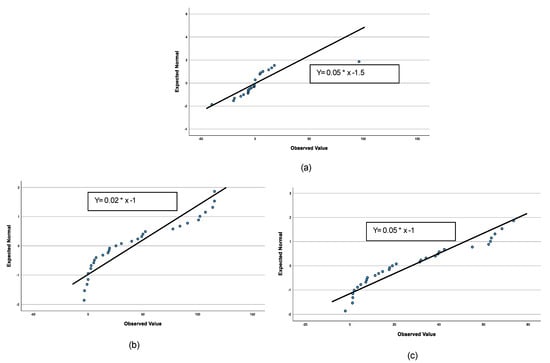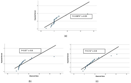 Table 4 presents the results of the normality tests for the schedule growth data of highway projects constructed using the P3, DB, and DBB project delivery methods. Figure 6 shows the corresponding Q-Q plots associated with this normality test. The results of the Kolmogorov–Smirnov normality tests reveal that the significance level (p-value) associated with the schedule growth for P3 and DB highway projects was less than 0.001, and for DBB highway projects, the p-value was 0.033 (less than a significance level of 0.05). This finding strongly indicates that the data did not adhere to a normal distribution and deviated from the standard normal distribution curve.
