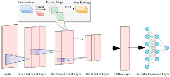 - Fully Connected Layer: Maps the extracted features to the final output (Equation (2)). The architecture and process of the CNN used in this paper are detailed in Figure 1.