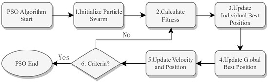 PSO is a swarm intelligence optimization method that simulates the foraging behavior of bird flocks [38]. The algorithm progressively approximates the optimal solution through collaboration and information sharing among particles within the search space. The specific process is illustrated in Figure 2, as follows: