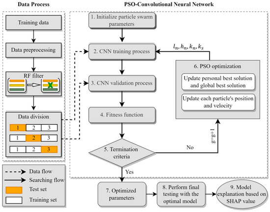 Selecting and adjusting network architecture parameters (such as the number of layers, neurons, convolutional kernels, and their sizes) and training parameters (such as learning rate, batch size, number of iterations, and regularization coefficients) are crucial for the regression accuracy and generalization capability of the CNN model [39]. This study integrates the PSO algorithm with a CNN and introduces the SHAP algorithm to enhance the model’s interpretability. The PSO algorithm automatically searches for the optimal parameter combination, while SHAP values provide precise explanations for model predictions, enhancing the transparency of the model’s decision-making process. The flowchart of the ASCNN algorithm is shown in Figure 3, and the steps are as follows: