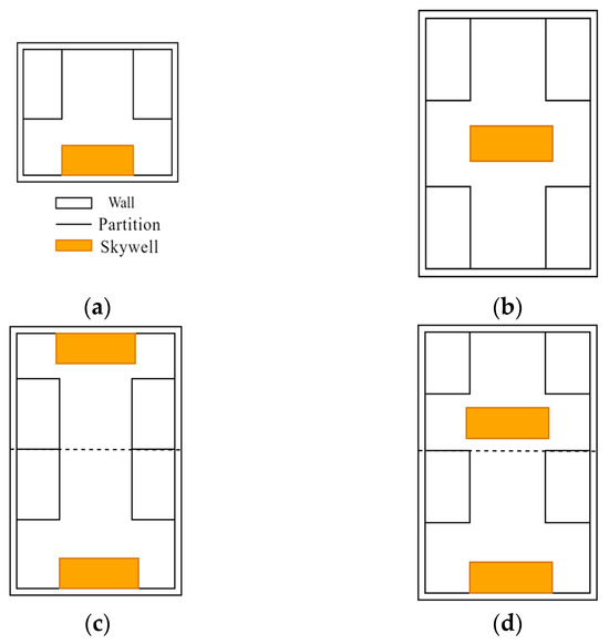 Floor plan of traditional Huizhou residential buildings: (a) “Ao”-shaped layout; (b) “Hui”-shaped layout; (c) “H”-shaped layout; (d) “Ri”-shaped layout.