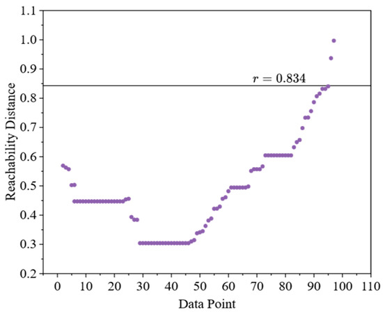 The OPTICS clustering algorithm is a density-based clustering method that automatically identifies clusters and outliers without the need to preset the number of clusters, exhibiting strong robustness [44]. The algorithm generates a reachability plot that illustrates the variation in data point density, where valleys represent the presence of clusters, and their depth indicates the tightness of the connections within the clusters, as shown in Figure 5. In this study, by setting a threshold based on the 95th percentile of reachability distances (r = 0.834), data points 60 and 92 in the plot, which are above this threshold, are identified as outliers because they exhibit a greater reachability distance compared to other points in the dataset.