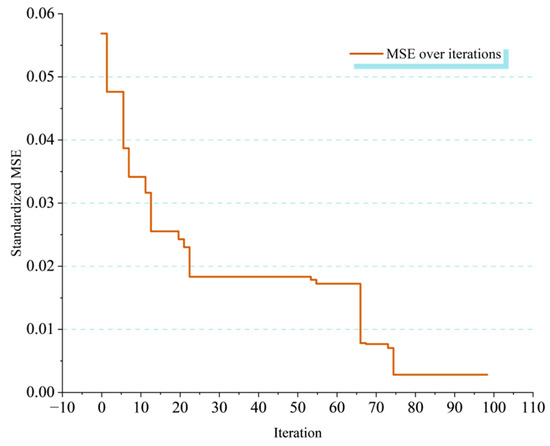 Predictions were performed according to the model parameters suggested in Table 4. Figure 7 illustrates the change in normalized MSE as the number of iterations in the PSO process increases. The MSE value decreases with the increase in the number of iterations, showing a significant decline from 0 to approximately 75 iterations. During this process, the PSO algorithm effectively adjusted the model parameters, resulting in a substantial reduction in model prediction error. After 70 iterations, the value stabilizes without significant changes, indicating that the PSO algorithm has essentially converged, finding an optimal combination of model parameters. The iterative process demonstrates the effectiveness of the PSO algorithm in this optimization process. The final standard MSE value is approximately 0.015, which is a significant decrease relative to the initial value, indicating that the PSO algorithm has significantly improved the model’s predictive accuracy.