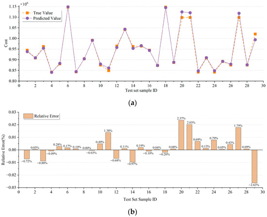 Figure 8b displays the distribution of relative errors for the test set samples in the cost prediction of replica traditional vernacular dwellings. The results indicate that the relative errors of the samples are all within ±3%, demonstrating that the model possesses high overall predictive accuracy and stability. Among the test samples, the maximum positive relative error is 2.37%, and the maximum negative error is −2.63%, which complies with the 3% precision range required for engineering budget preparation and is significantly lower than the requirement to control cost errors within ±10% during the detailed feasibility study phase. This indicates that the model has high predictive precision in most cases. Additionally, it is observed that the relative errors for the majority of samples are within ±2%, with a balanced error distribution and a small overall magnitude, suggesting that the model’s predictions are stable and reliable, without significant fluctuations. This stability is crucial for cost budgeting and control in practical applications. The error distribution in the figure shows an alternating pattern of positive and negative values, without a noticeable bias, indicating that the model exhibits balanced performance in terms of overfitting or underfitting. It should be noted that the dataset samples collected in this study are relatively small; an increase in the quantity and quality of training samples is expected to further improve predictive accuracy.