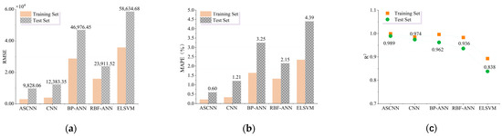Figure 9 presents the performance metrics of various models on the test dataset, where the ASCNN outperforms all other models across all indicators, particularly in MAPE and R2, demonstrating its strong predictive accuracy and fitting capability. Specifically, the RMSE of ASCNN is the lowest in both the training and test sets, indicating the smallest error between predicted and actual values. In comparison, the RMSE of the unoptimized CNN increased by 26%, and the MAPE increased by 102%. Other models show significantly higher RMSE than ASCNN, with the ELSVM model performing the worst. The MAPE of ASCNN is the lowest in both the training and test sets, with a particularly minimal value of 0.6% on the test set, indicating the smallest predictive error. Moreover, the R2 values of ASCNN are close to 1 in both the training and test sets, indicating the best fitting effect. Other models have R2 values lower than ASCNN, with ELSVM having the lowest R2 value and the worst fitting effect.
