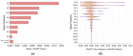 The SHAP value distribution illustrated in Figure 10b offers an in-depth insight into the contribution of each feature in the model’s prediction. The results show that the SHAP values of Plan Layout (X4) and Roof Area (X13) cover a wide range with significant differences, indicating that these two features play a notable role in the cost prediction of ancient dwellings. In particular, the broad distribution of SHAP values for Plan Layout (X4) and Roof Area (X13) suggests a potentially complex nonlinear relationship between these factors and the predicted outcomes.