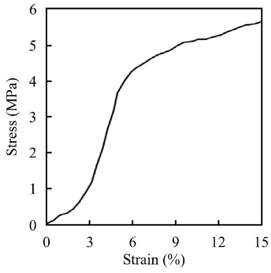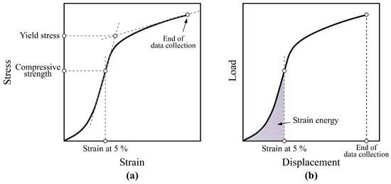 The partial compression test was performed based on the conditions specified below by the test methods for wood [] using twenty pieces of wood specimens conditioned at each drying temperature. This standard follows the guidelines specified by ISO 13061-6:2014 []. In this test, wood specimens were placed on the surface of a universal material testing machine (SV-201NA, Imada Seisakusho Co., Toyohashi, Japan) with the bark side up. A block of stainless steel (SUS304) with a 10 mm width was then placed on the tangential section of the specimen to apply a partial compressive load to the contact area of 100 mm2. The compressive load was applied through a jig with a free-end attached to the load cell (TCLZ-2KNA, Tokyo Measuring Instruments Laboratory Co., Ltd., Tokyo, Japan), and a displacement rate of 1 mm/min was applied to the specimen. A data logger (PCD-320 A, Kyowa Electronic Instruments Co., Ltd., Tokyo, Japan) was used to collect and output data on temporal changes in load and displacement. Data collections were performed every second until the stainless-steel block indented the specimen up to 1.5 mm. Young’s modulus in partial compression perpendicular to grain, yield stress, and compressive strength were obtained based on the data. Figure 2 shows examples of each value determined in this study. The yield stress was determined based on the intersection of two tangent lines of the stress–strain curve [,], one in the elastic region and the other in the plateau region, because of the difficulty in finding a clear yield point in the curve during partial compression of wood []. This study also evaluated compressive strength at 5% strain because most specimens presented an increasing trend with strain progress, as shown in Figure 2a. This is because in porous materials, including wood, compression perpendicular to the wood fiber direction usually involves the densification of the cell wall structure []. In addition, the amount of mechanical work shown in Figure 2b was also evaluated based on integrated values of the load–displacement curve as the strain energy []. The integrated value for strain energy was calculated based on the load–displacement curve ranging from the starting point to each strain condition: 5% strain and maximum strain.